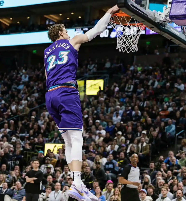 凭借如此出色的表现,马尔卡宁不仅荣膺进步最快球员奖,还首次入选全明星并顶替受伤的锡安进入首发阵容。媒体开始将他誉为“北境之王”,爵士球迷更将他视为队史传奇卡尔·马龙的接班人。2024年休赛期,爵士队用5年2.38亿美元的超级顶薪锁定了这位芬兰球星。这份合同使他的年薪从1800万飙升至4200万,实现了从“软蛋”到顶薪巨星的华丽转身。
