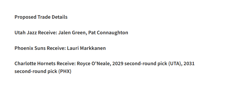 有消息传出了一个可能的交易方案:犹他爵士队得到杰伦·格林、帕特·康诺顿;菲尼克斯太阳队得到劳里·马尔卡宁;夏洛特黄蜂队得到罗伊斯·奥尼尔,2029年次轮选秀权(来自爵士),2031年次轮选秀权(来自太阳)。这样的交易对于太阳队来说,或许是一个不错的选择,既能得到他们急需的火力点,又不会付出过于沉重的代价。