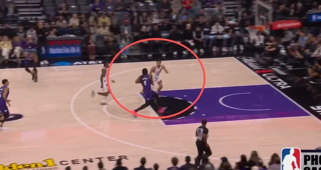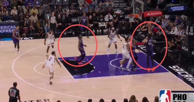 克利福德翻身后仰强投被帽,阿丘瓦拿到地板球后面对前来扑防的布克:先是虚晃,